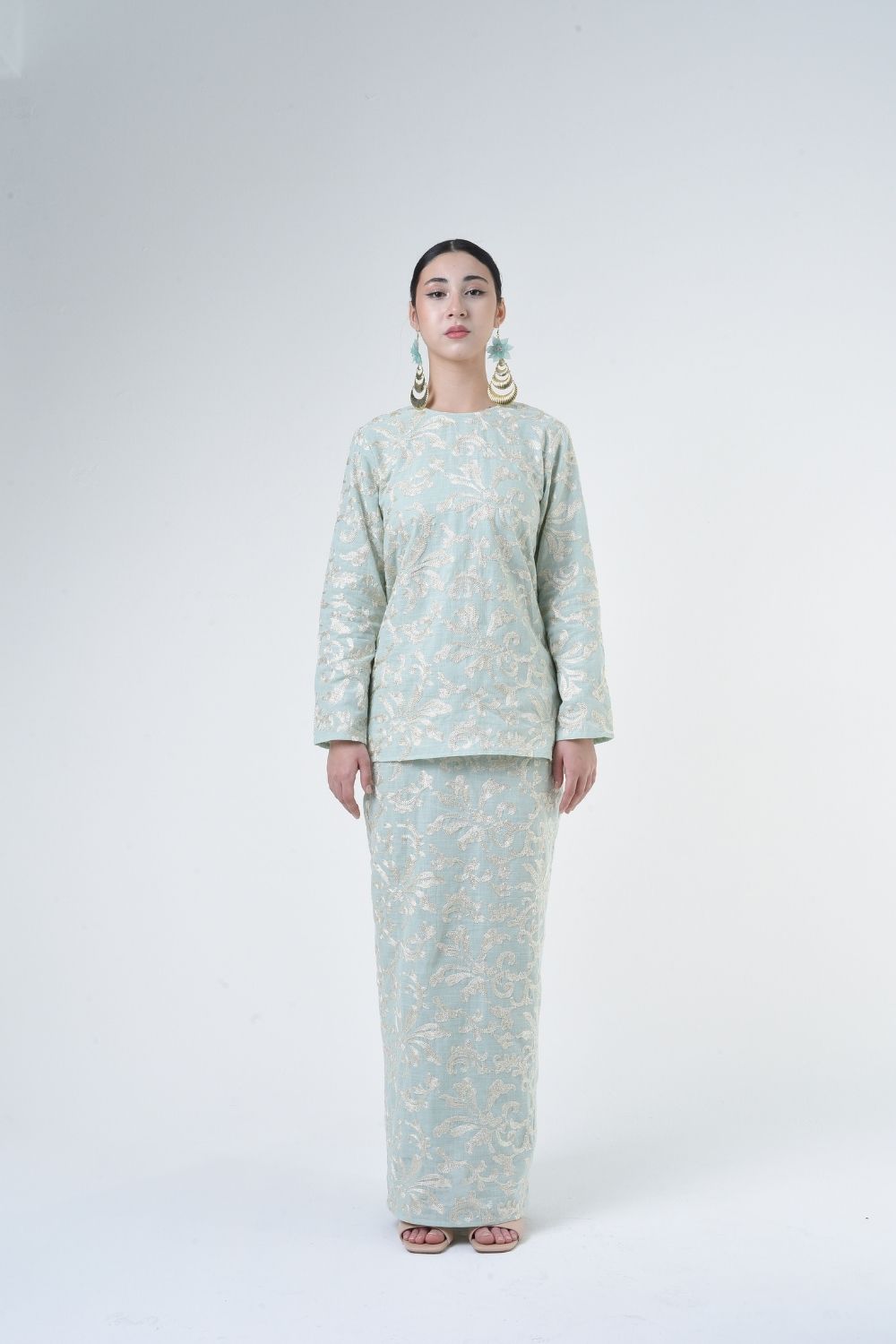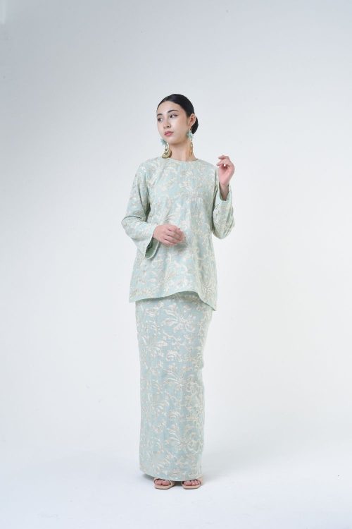 Description. This stylish two-piece set features a loose fitting cut top in the kurung kedah style, paired with a box pleated skirt. This elegant light grayish green embroidered linen kurung kedah, featuring intricate gold color thread floral and geometric embroidery. The detailed needlework adds a touch of sophistication and artistry to a timeless silhouette….