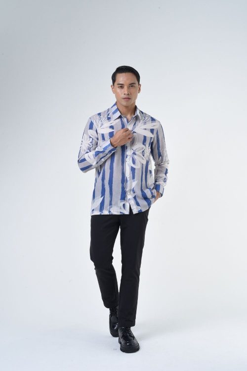 Description: This relaxes cut men’s long sleeve batik shirt features intricate stripe patterns. Its tailored fit makes it versatile for formal occasions, creating a striking statement piece that celebrates cultural heritage. Details: 70% Composition Linen Shirt Collar Long sleeves with cuff button Color: Stone Gray and Slate navy