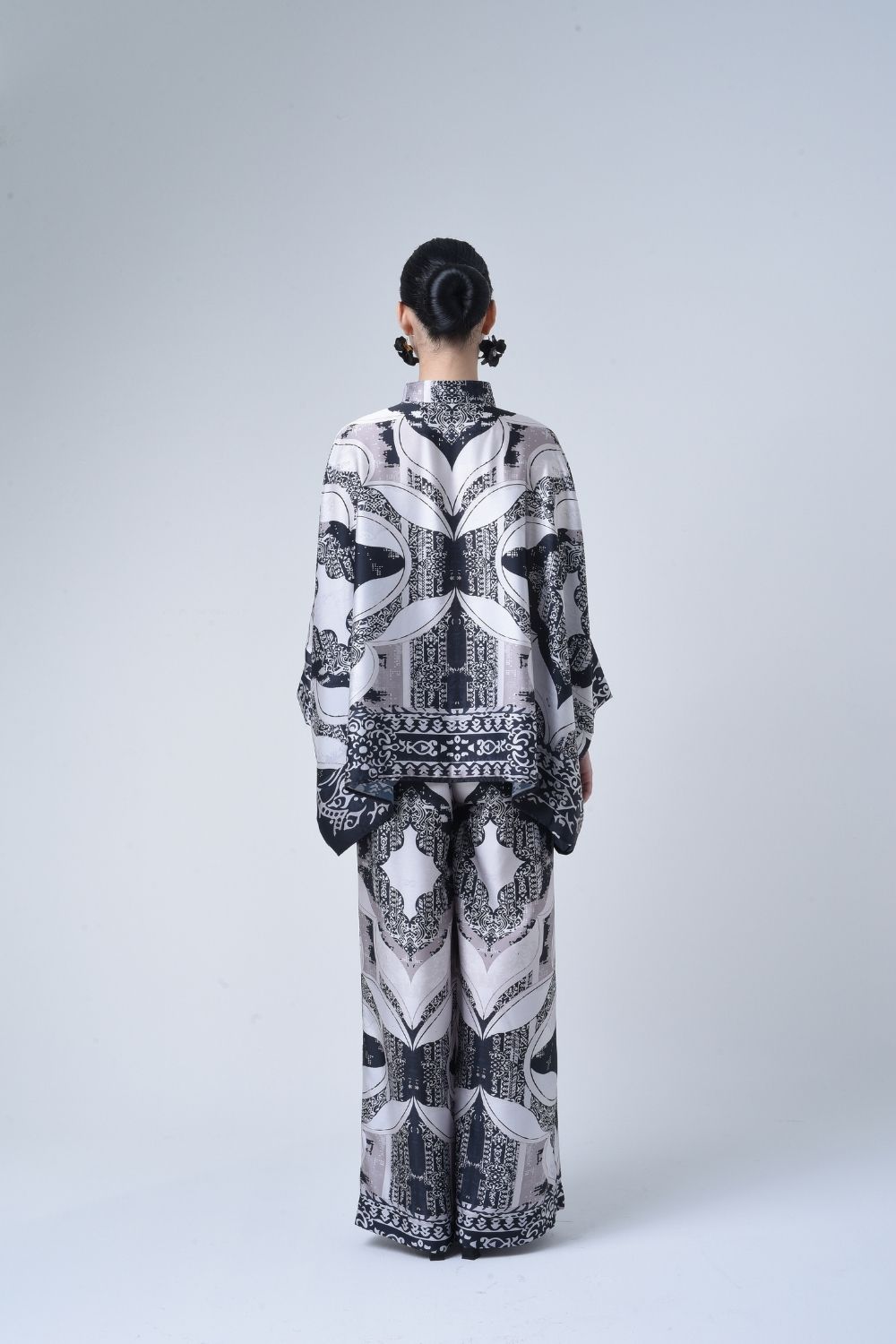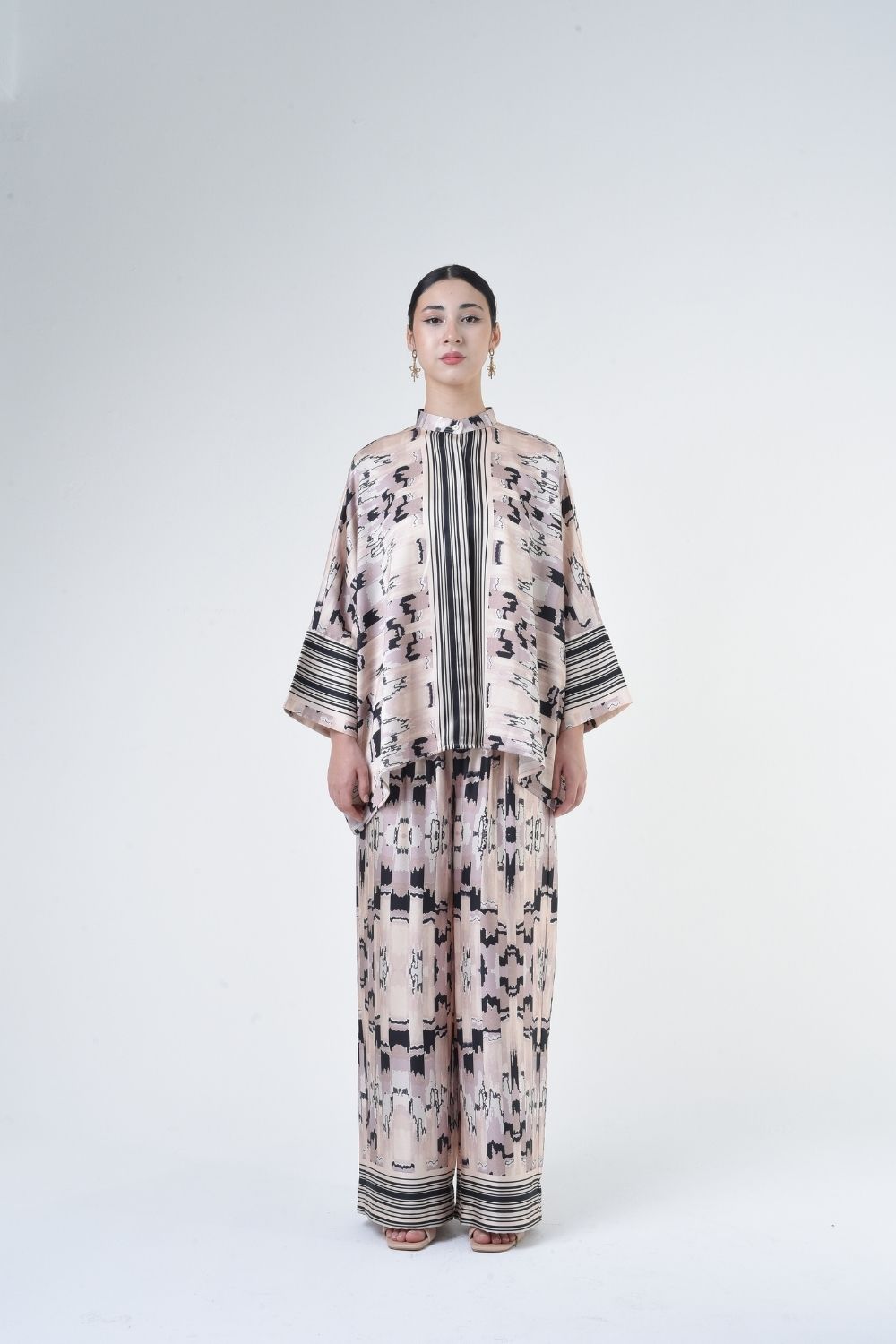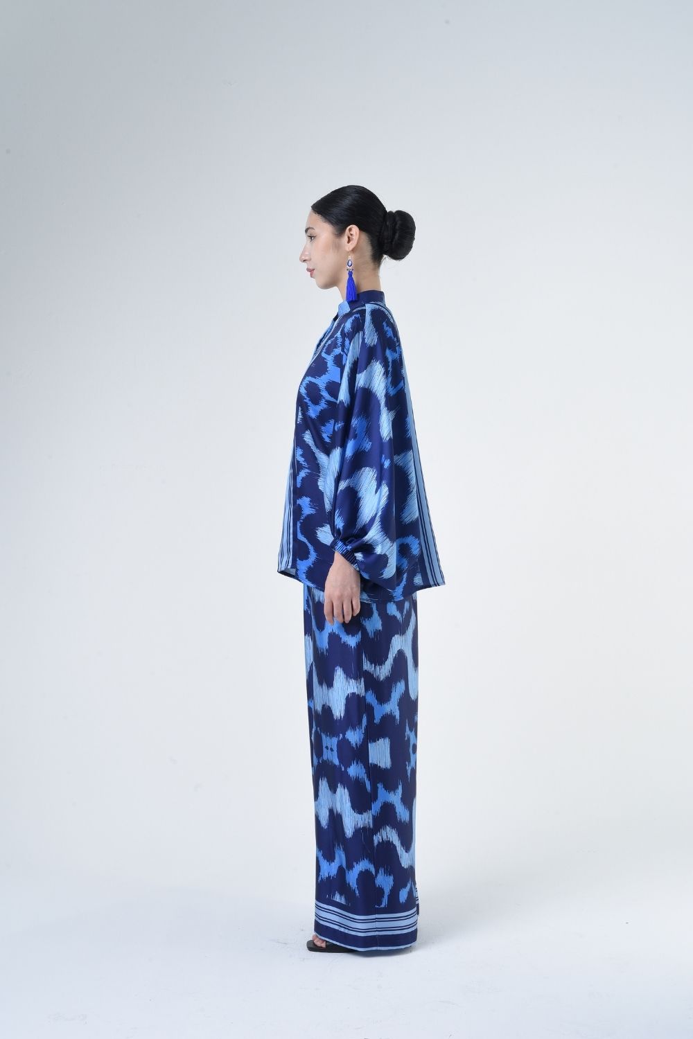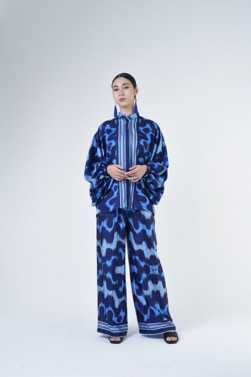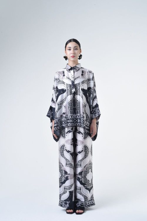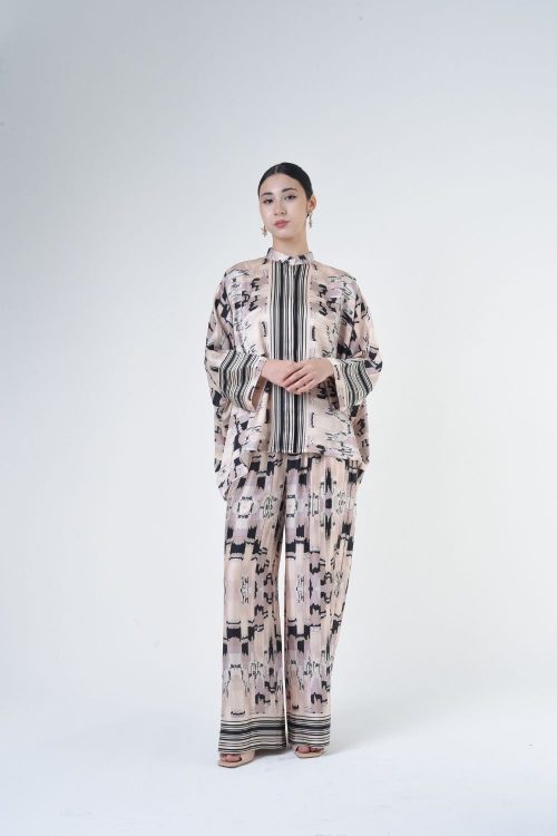 Description: This 2-piece loose top with loose pants is distinguished by its fresh, versatile cut, enlightened by ikat batik placement. Our collection is designed to make you feel like the confident, stylish woman you were destined to be. Details: 100% Composition mate satin Mandarin Collar Fully Hidden Button Opening at The Front Elastic…