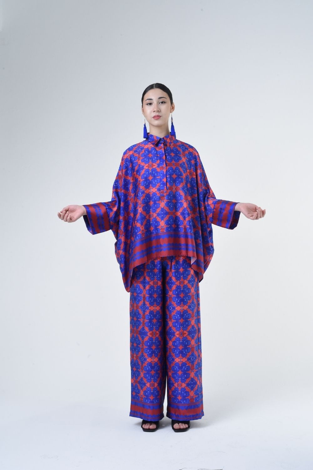 Description: This 2-piece loose top with loose pants is distinguished by its fresh, versatile cut, enlightened by modern antique tiles placement. Our collection is designed to make you feel like the confident, stylish woman you were destined to be. Details: 100% Composition mate satin Classic Collar Half Hidden Button Opening at The Front…
