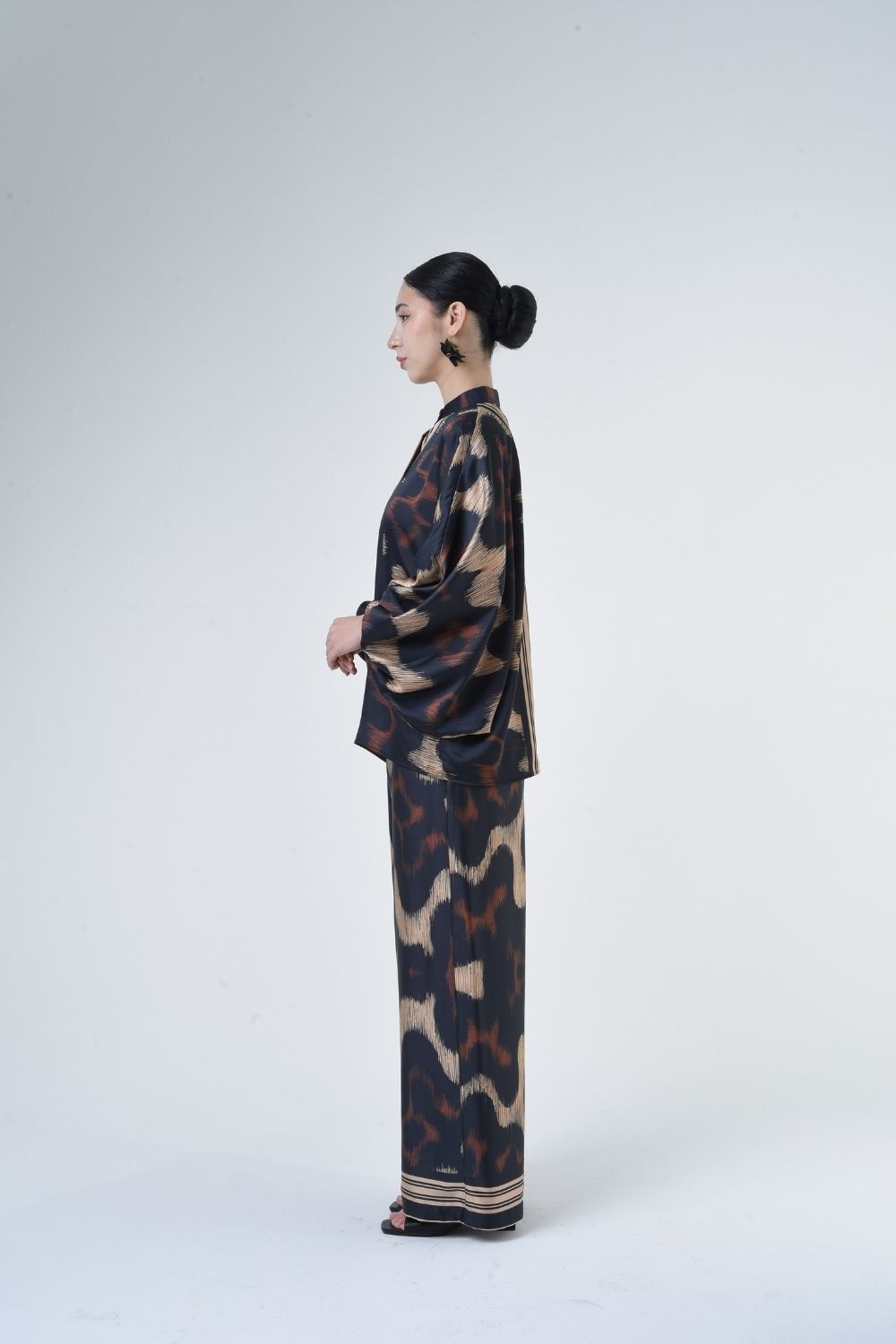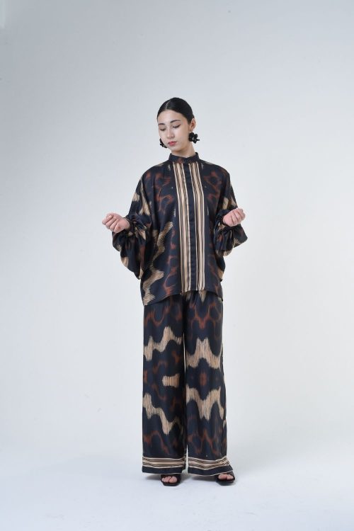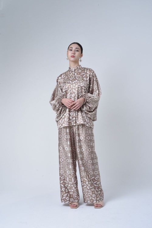 Description: This 2-piece loose top with loose pants is distinguished by its fresh, versatile cut, enlightened by modern antique tiles placement. Our collection is designed to make you feel like the confident, stylish woman you were destined to be. Details: 100% Composition mate satin Mandarin Collar Fully Hidden Button Opening at The Front…
