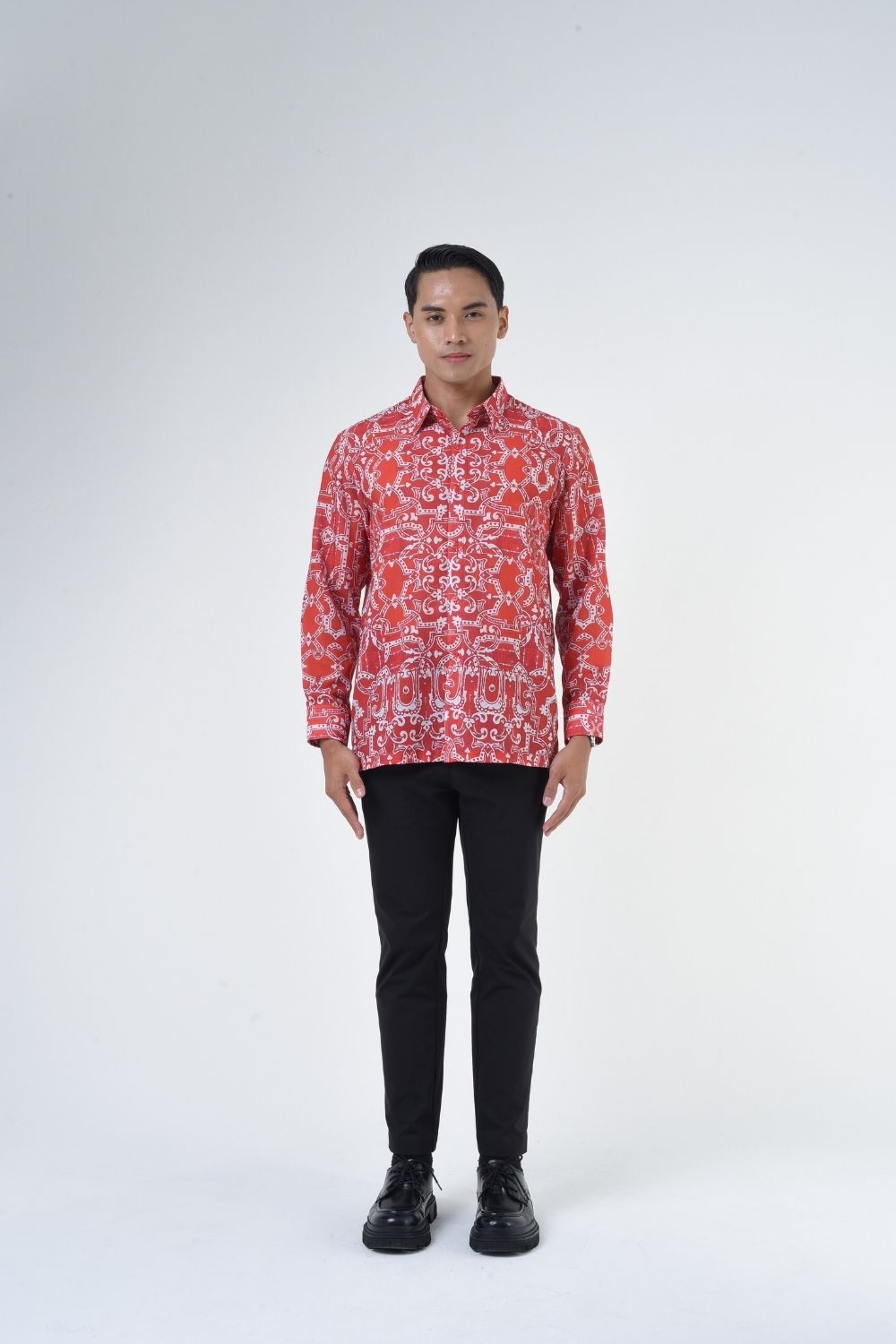 Description: This relaxed cut men’s long sleeve batik shirt features intricate ethnic patterns. Its tailored fit makes it versatile for formal occasions, creating a striking statement piece that celebrates cultural heritage. Details: 100% Composition Linen Shirt Collar Long sleeves with cuff button Color: Grenadine mix with bittersweet